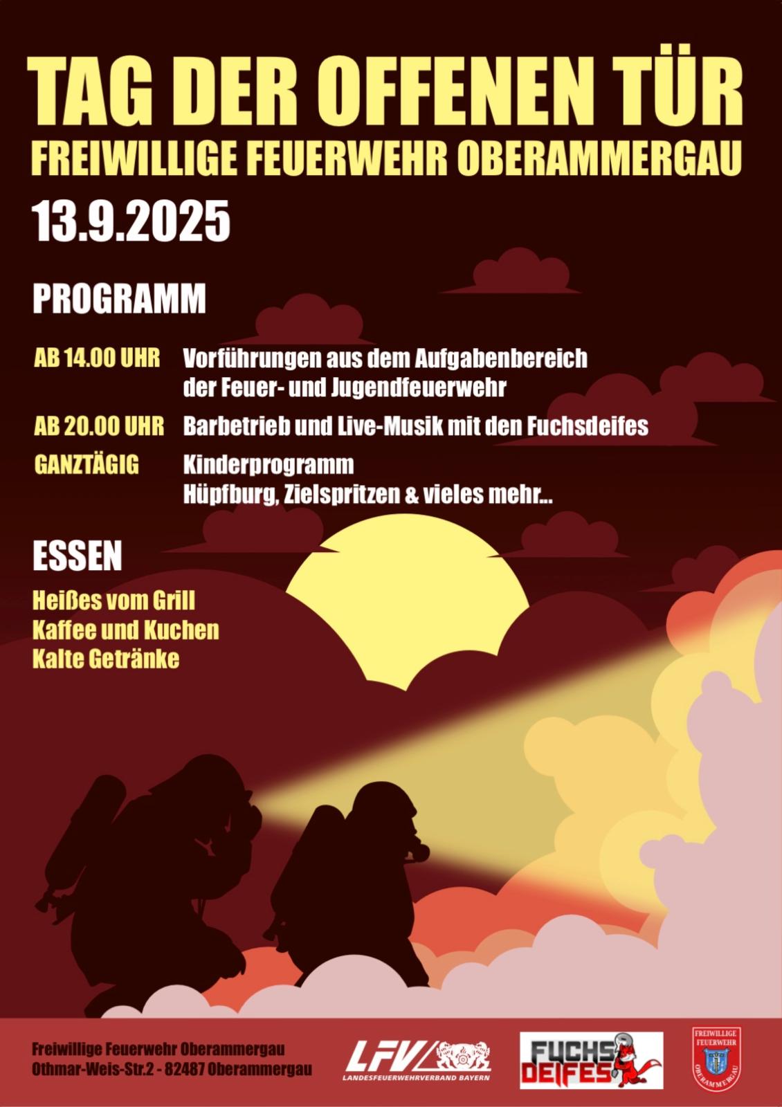 Die Freiwillige Feuerwehr Oberammergau lädt ein zum: TAG DER OFFENEN TÜR 2025 Wann: 13.09.2025 ab 14:00 Uhr Wo: Freiwillige Feuerwehr Oberammergau, Othmar-Weis-Str.2, 82487 Oberammergau Programm: Vorführungen aus dem Aufgabenbereich der Feuer- und Jugendfeuerwehr ab 20 Uhr Barbetrieb und Live-Musik mit den Fuchsdeifes Kinderprogramm mit Hüpfburg, Zielspritzen & vielem mehr… Für das leibliche Wohl ist gesorgt. […]