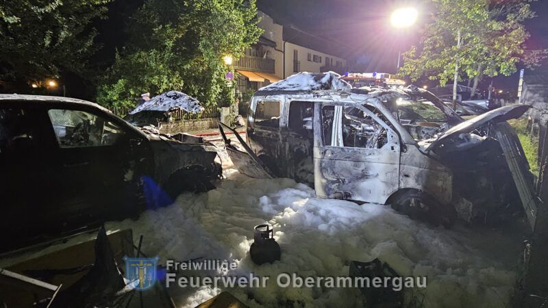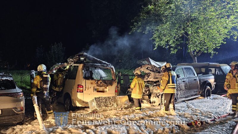 Beim Eintreffen stand ein Volkswagen Campingbus in Vollbrand und das Feuer hatte sich bereits auf einen danebenstehenden gasbetriebenen Pickup ausgebreitet. Ein weiteres Elektrofahrzeug drohte Feuer zu fangen. Wir begannen umgehend mit der Brandbekämpfung mit Schaum und konnten ein Übergreifen der Flammen auf das dritte Fahrzeug verhindern. Personen kamen glücklicherweise nicht zu Schaden.