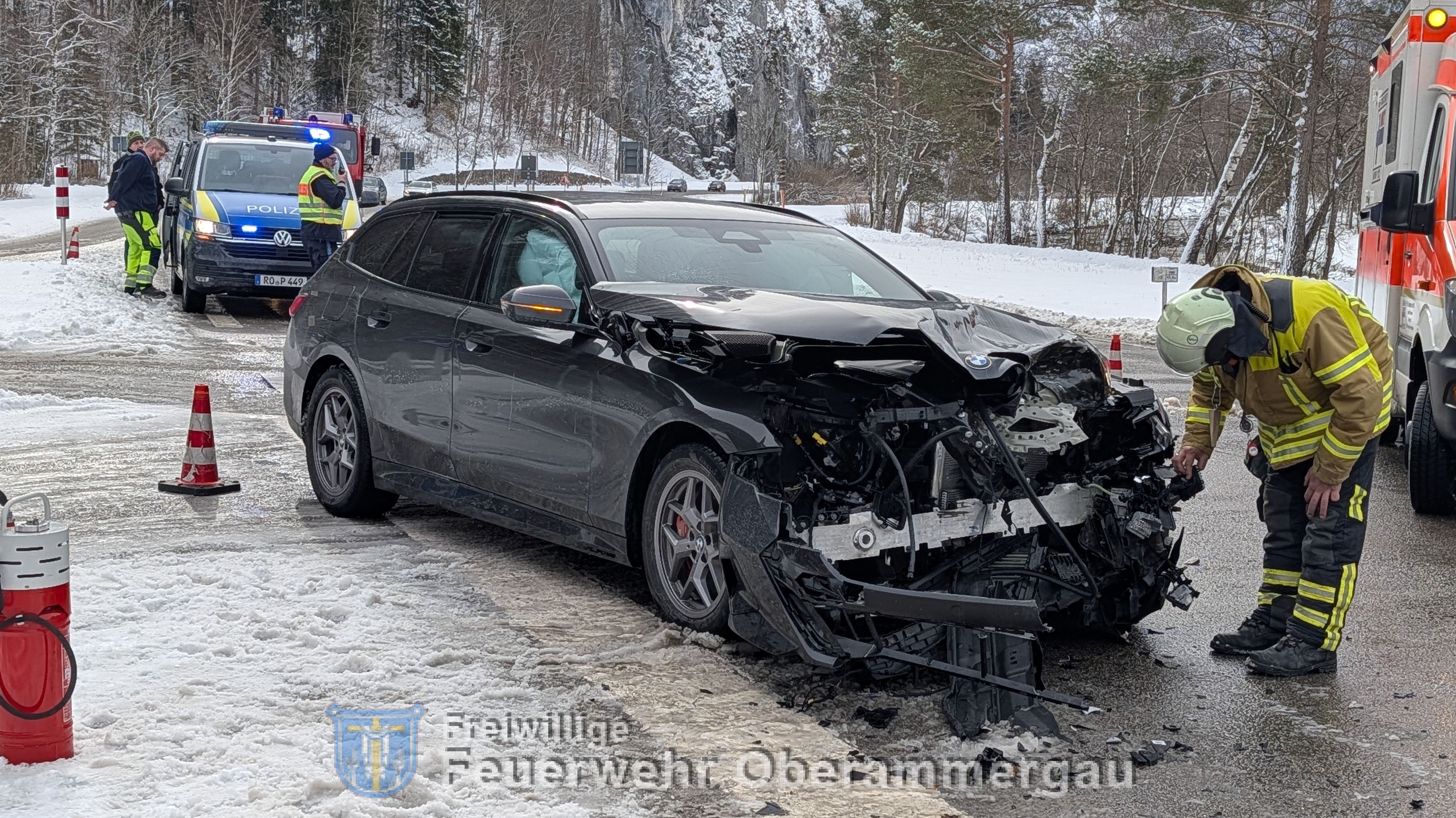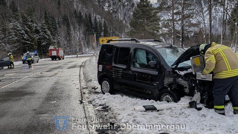 Ein BMW-Fahrer war am Ortsausgang Oberammergau aufgrund der witterungsbedingten Straßenverhältnisse nicht rechtzeitig zum Stehen gekommen und auf die B23 gerutscht, wo er mit einem Mercedes kollidierte.