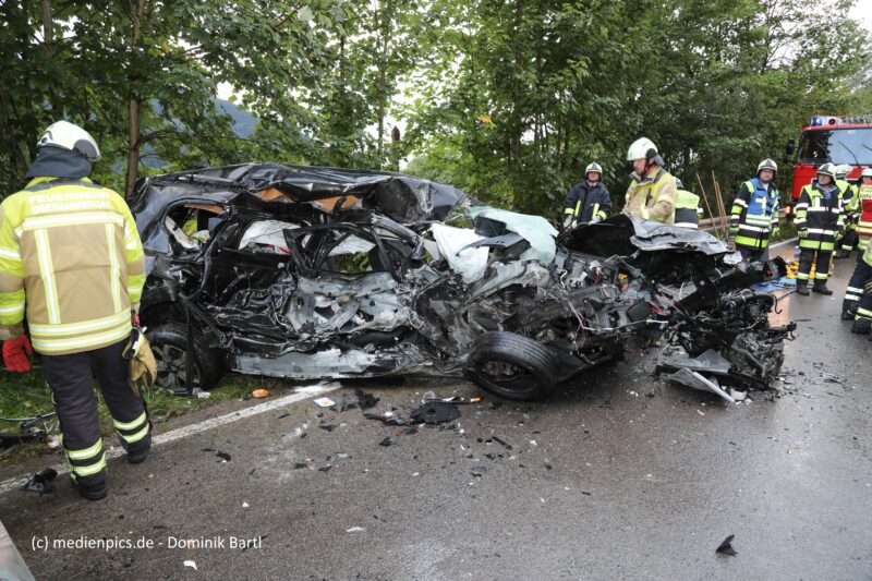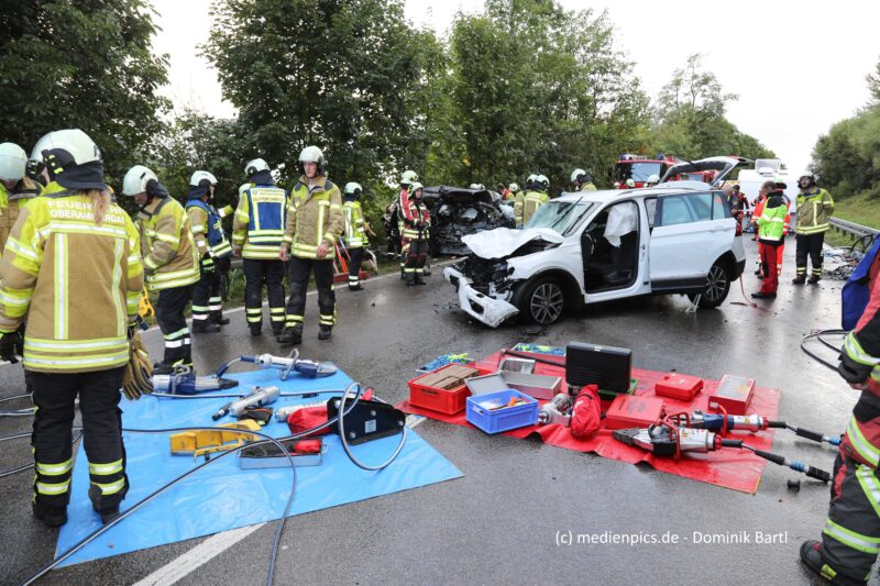 Zu einem schweren Verkehrsunfall auf der B23 zwischen Altenau und Unterammergau wurden wir am Sonntag, den 14.09.2025, um 07:25 Uhr alarmiert. Ein Pkw-Fahrer war aus bisher ungeklärter Ursache in Richtung Saulgrub mit einem entgegenkommenden Wohnwagengespann kollidiert. Durch den starken seitlichen Aufprall überschlug sich das Fahrzeug und blieb auf dem Dach liegen. Zusammen mit den Kameraden aus Unterammergau und Bad Kohlgrub richteten wir den Pkw wieder auf und befreiten den schwer verletzten Fahrer mit hydraulischem Gerät. Auch die beiden verletzten Insassen des Wohnwagengespanns wurden aus ihrem Fahrzeug geborgen und dem Rettungsdienst übergeben.